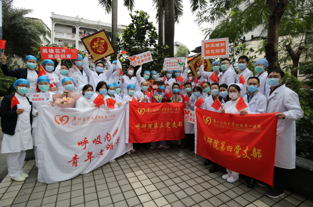 钟南山院士在医院迎接5名"战士"——陈爱兰、谢佳星、张建恒、彭红、李颖贤,“你们在武汉汉口医院克服了重重困难,抢救了很多病人,顺利完成这次任务,没有辜负医院和广州的期待,回来以后,我们可以继续并肩战斗!欢迎你们平安健康地回来!”